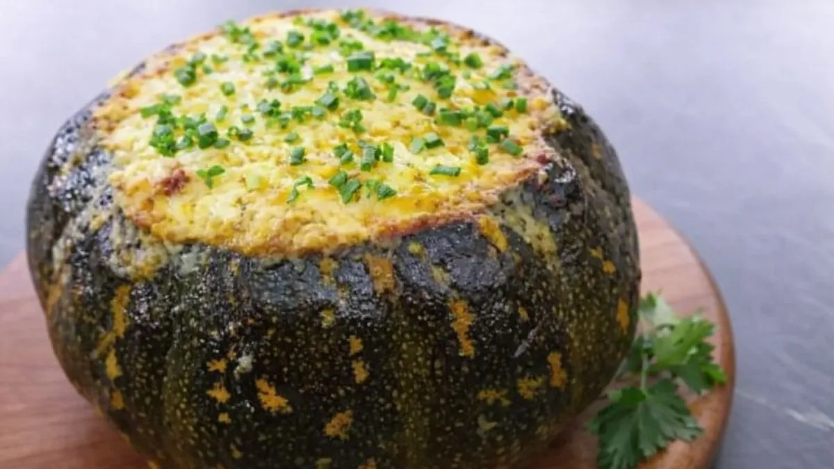 Abóbora cabotiá recheada com carne desfiada, creme aveludado e gratinado dourado. Receita reconfortante, fácil e perfeita para o frio.